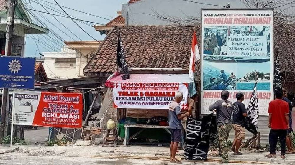 Masyarakat wilayah pesisir memasang baliho sebagai pernyataan menolak proyek Surabaya Waterfront Land (SWL). Foto Istimewa